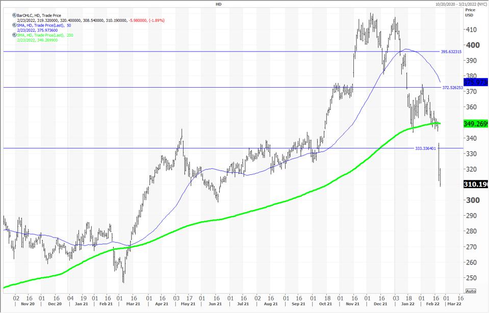 The close below its 200-day SMA on February 18 provided a warning before the earnings release on February 22. Note that as 2022 began, that shares of Home Depot closed at $393.61 on January 7. This was below the 50-day SMA and its quarterly pivot at $395.61 which is the highest horizontal line.