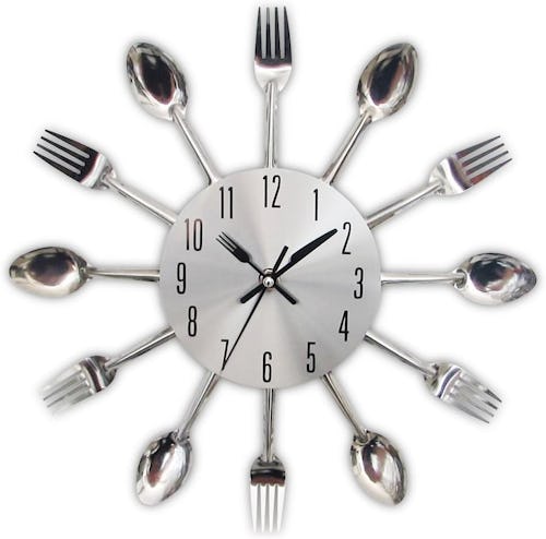 Designed with a clever spoon-and-fork motif, this 3D cutlery clock turns an ordinary wall into a playful kitchen statement. The tiny clock hands are a fork and a knife, and it’s completely silent — there’s no annoying ticking to deal with. The clock is powered by one AA battery, which is not included. You can buy it in up to six colors.