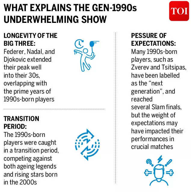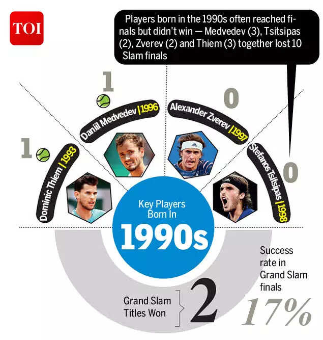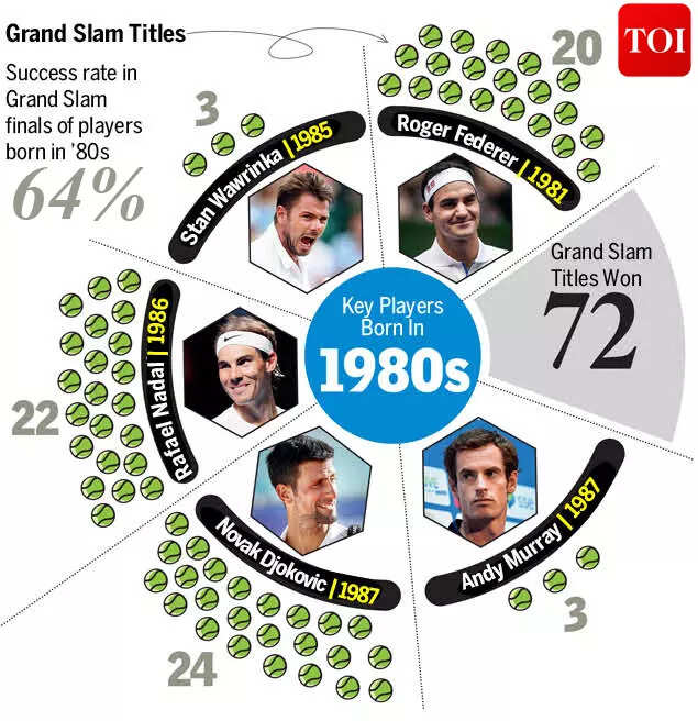 Players born in the 1980s, like Federer, Nadal, and Djokovic, dominated men's tennis Grand Slam titles, while those born in the 1990s struggled in the shadow of these legends.