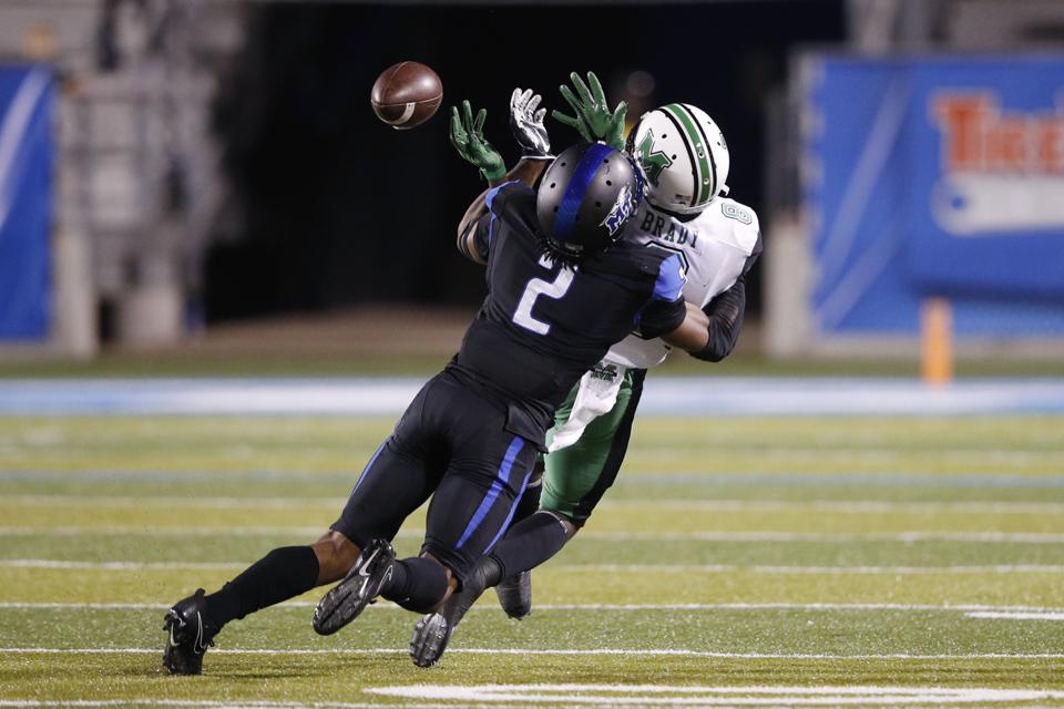 Charvarius Ward of the Middle Tennessee Blue Raiders defends a pass intended for Tyre Brady of Marshall in the third quarter of a game at Floyd Stadium on Oct. 20, 2017. (Photo by Joe Robbins/Getty Images) Getty Images