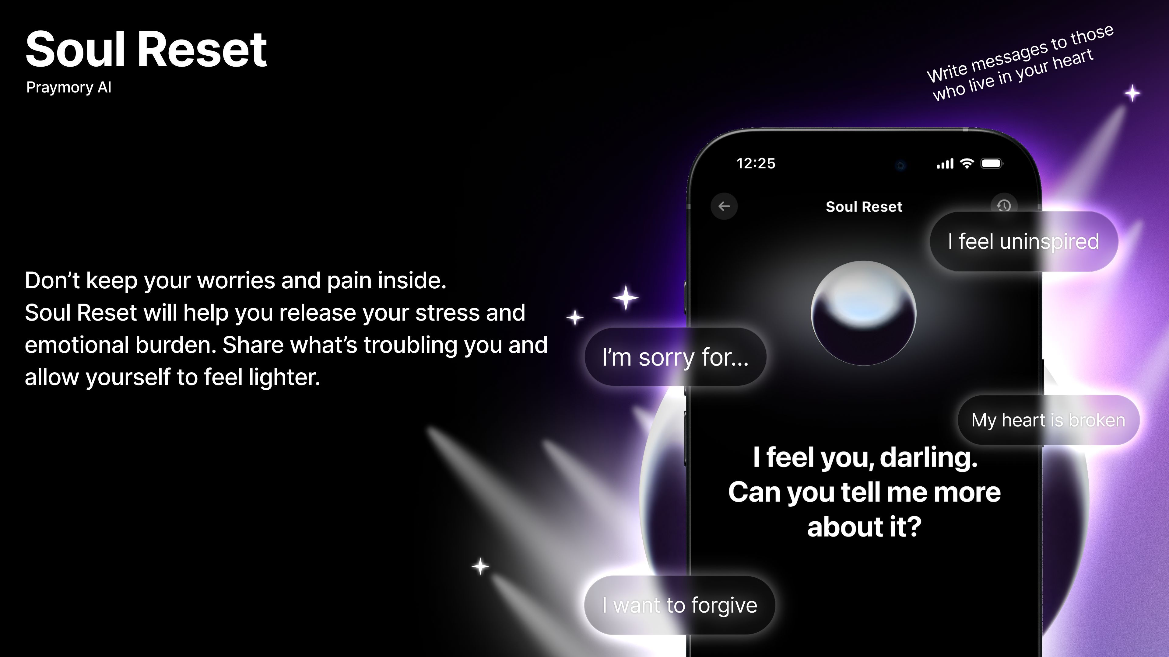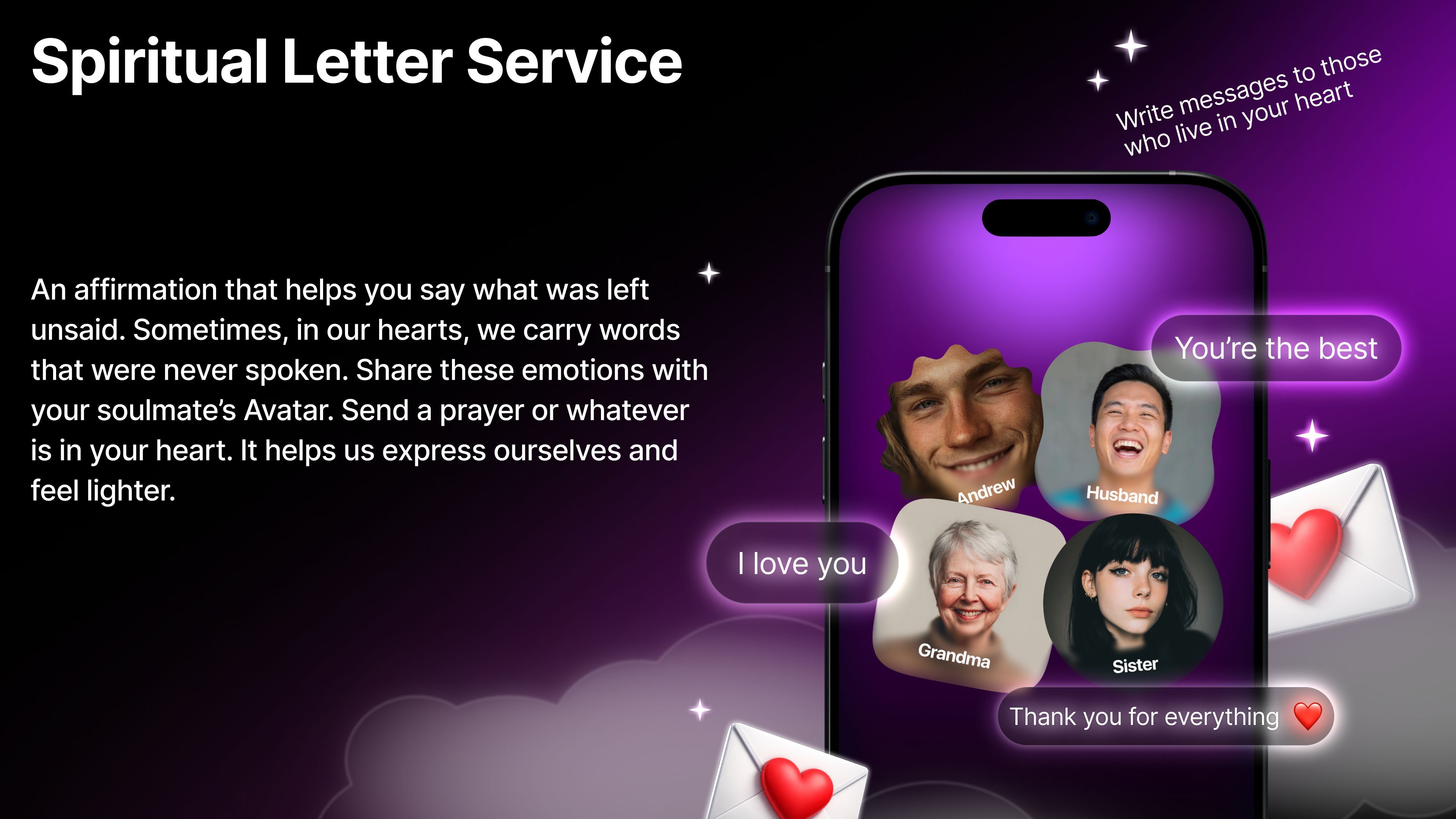 Praymory also lets you send a prayer or message to your Soulmates. You can share thoughts from the heart and say what you could not say before. This affirmation-based feature is called SLS (Spiritual Letter Service). You can send letters, prayers, and words safely, believing they will be heard. Praymory gives attention to those who truly need it: a small space on your phone where there is only you and your message. There is no reply. We simply believe.