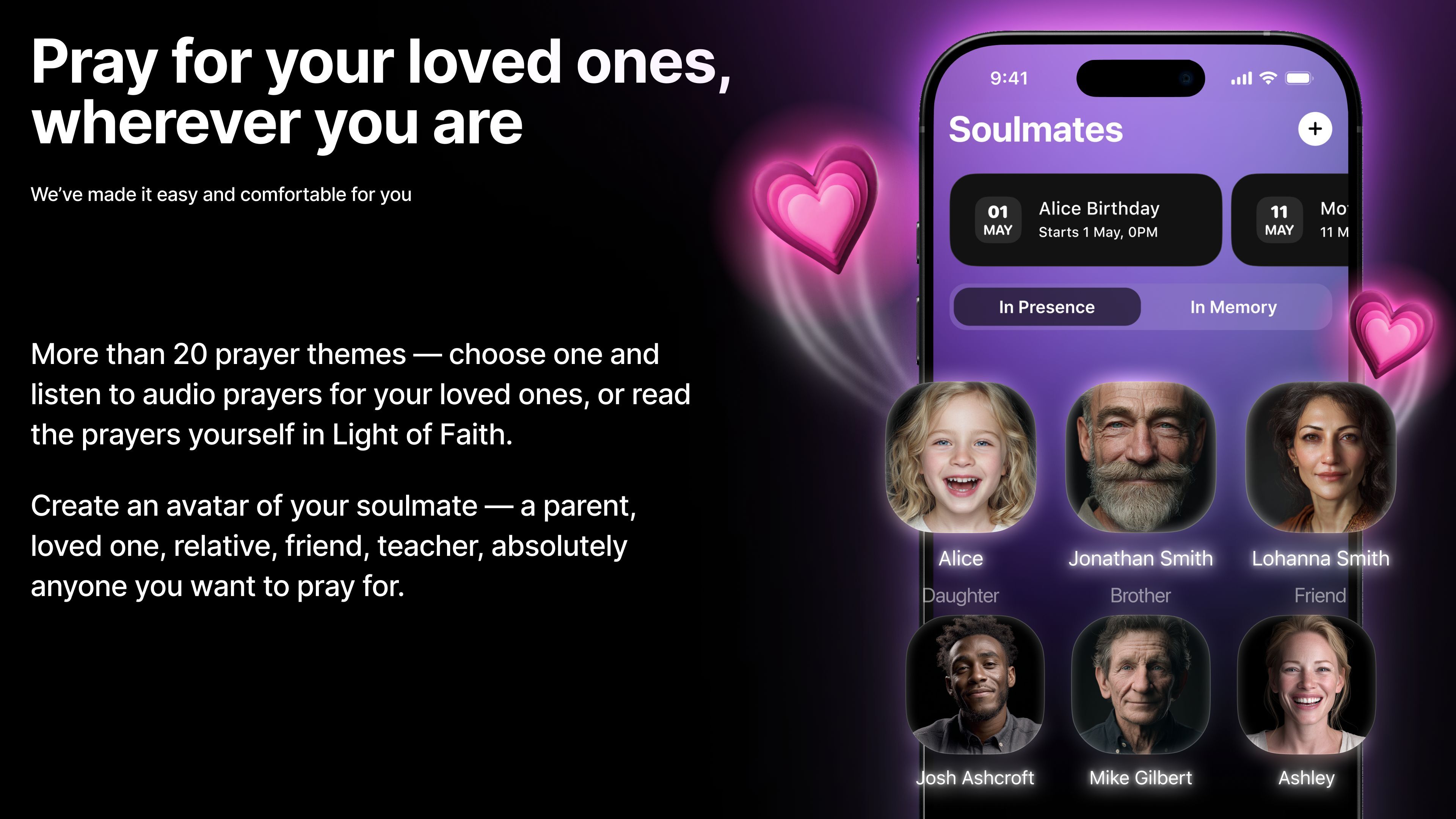 Soulmates is an avatar of a loved one: a mother or father, a relative or a friend, any person you want to pray for. In Praymory there are two Soulmates categories: In Presence and In Memory, for those who will remain in our hearts and memories forever. You create your Soulmates in the app, and they are always near. One tap and the prayer is already playing.