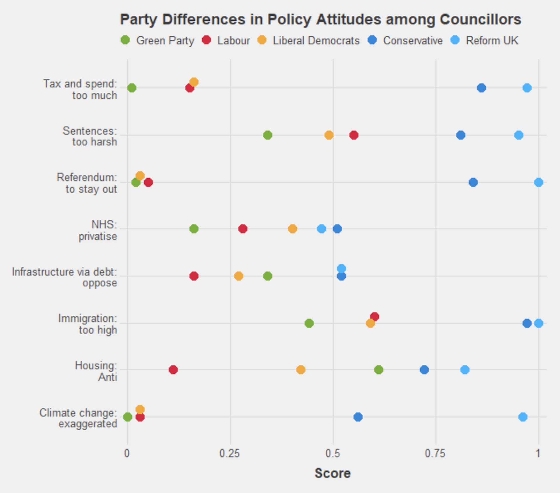 We rated the councillors’ responses to some questions on a 0-1 scale. When asked about immigration, for example, a rating of 0 suggests the councillor thought immigration too low, and 1 that they thought it too high. On this issue, Reform UK scored 1 – every councillor surveyed thought immigration had been too high.