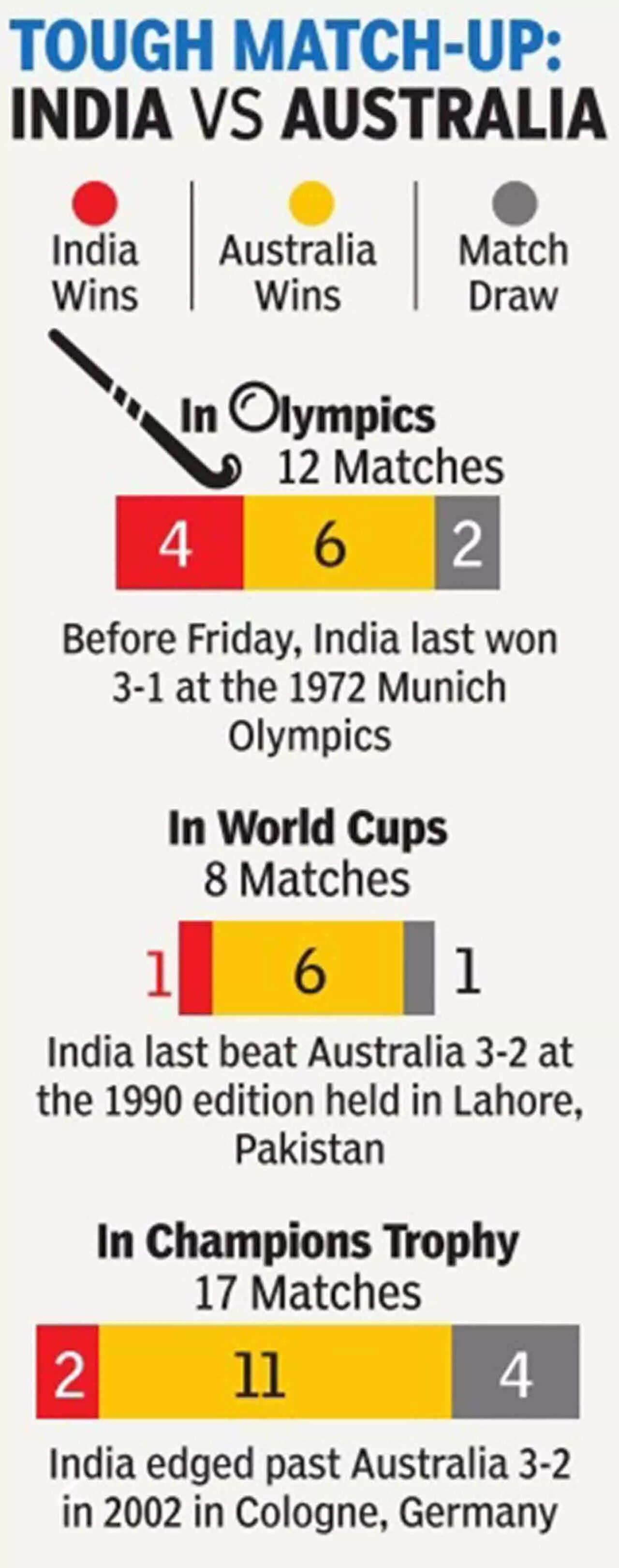 PARIS: This was a match to decide where India would finish on the points table in Pool B of the hockey competition - a match against a team India have suffered against over the years. In fact, India had not beaten Australia since the 1972 Munich Games in the Olympics. One would not have blamed the Indian supporters for being a bit apprehensive at the Yves-du-Manoir Stadium here on Friday afternoon.