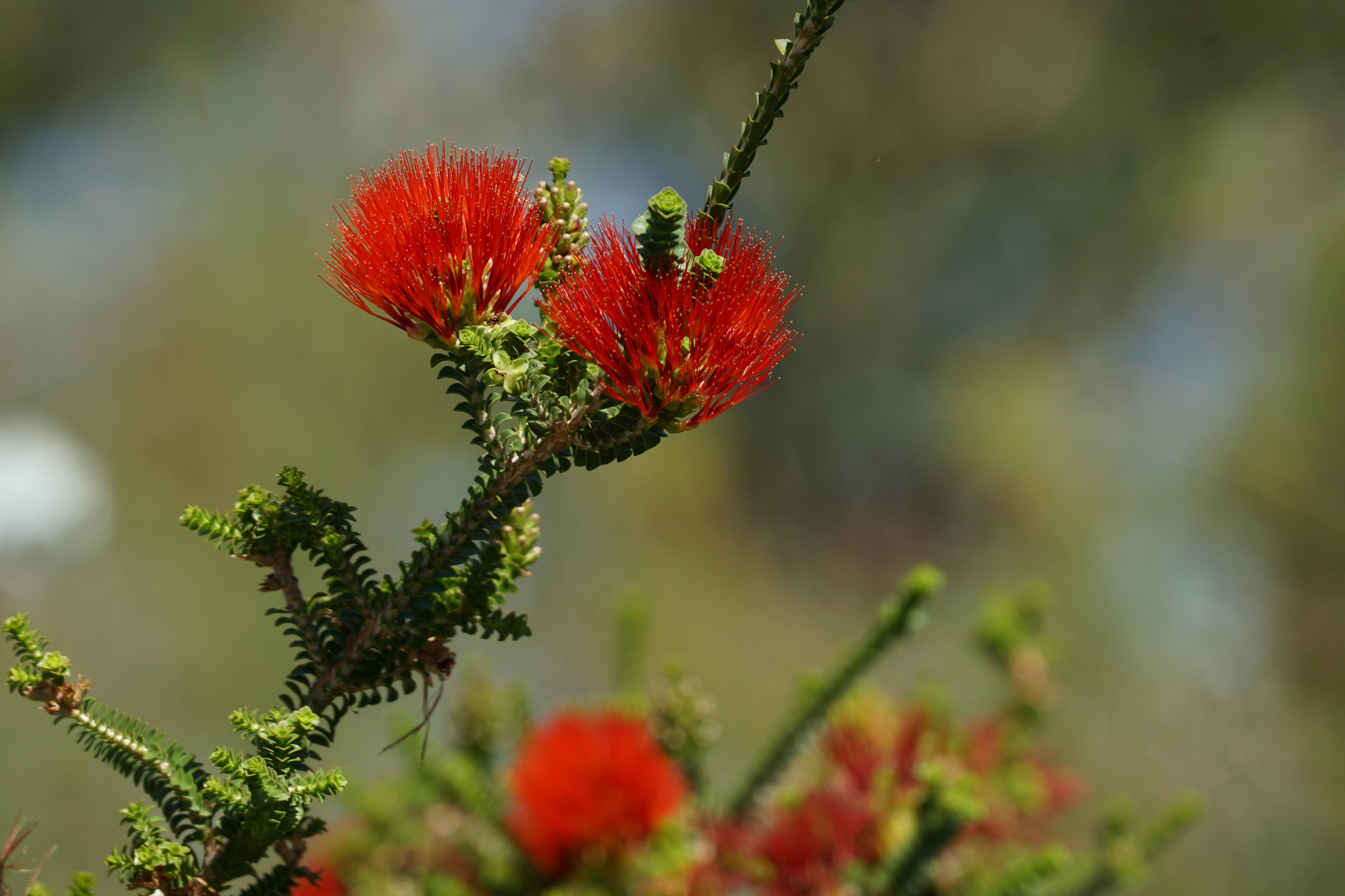 White flowers of the tea tree or weeping peppermint begin to show and flashes of purple begin to brighten winter days.