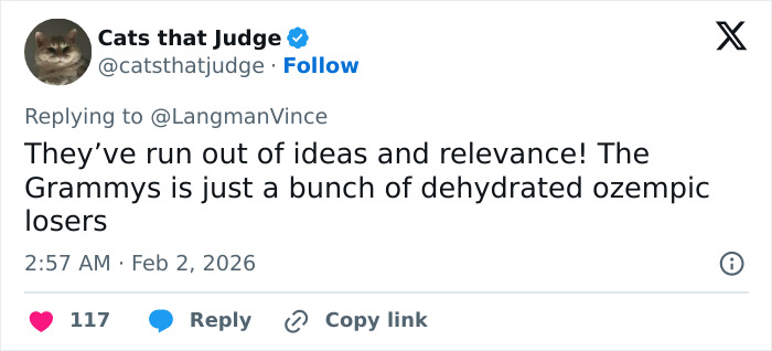 The latter comment stemmed from what many perceived as an uncanny resemblance between the 2026 Grammys stage design and a 2023 advertisement for the medication, which featured multiple shades of yellow and orange circular discs forming an “O.”