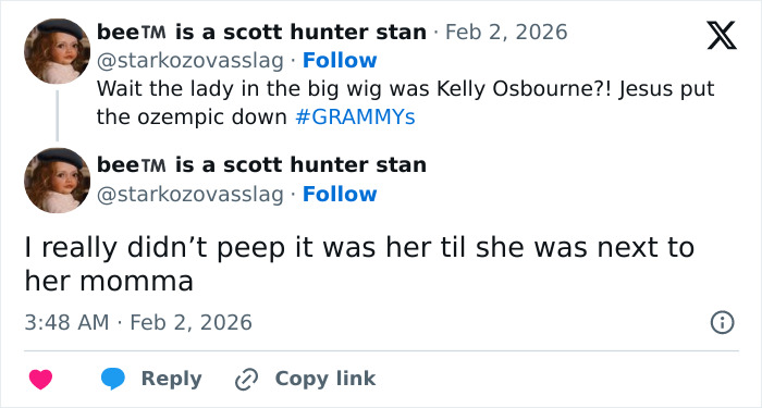 “Wait, the lady in the big wig was Kelly Osbourne?! Jesus put the o**mpic down!” commented another.