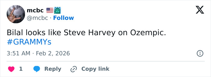 Meanwhile, critically acclaimed R&B and soul musician Bilal, who was nominated for Best Progressive R&B Album for Adjust Brightness and also took the stage during a high-profile In Memoriam tribute led by Lauryn Hill, was unexpectedly dubbed a “Steve Harvey lookalike” by commentators due to his altered appearance.