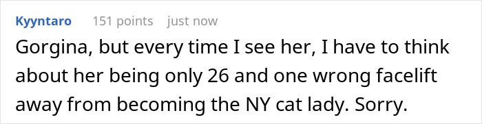 One Reddit user harshly remarked, “Every time I see her, I have to think about her being only 26 and one wrong facelift away from becoming the NY cat lady. Sorry.”