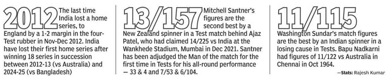After England's Ian Botham, who took 13-106 at Mumbai in 1980, and teammate Ajaz Patel, who took 14-225 also at Mumbai in 2021, Santner's haul was the third-best haul by a visiting bowler in India.