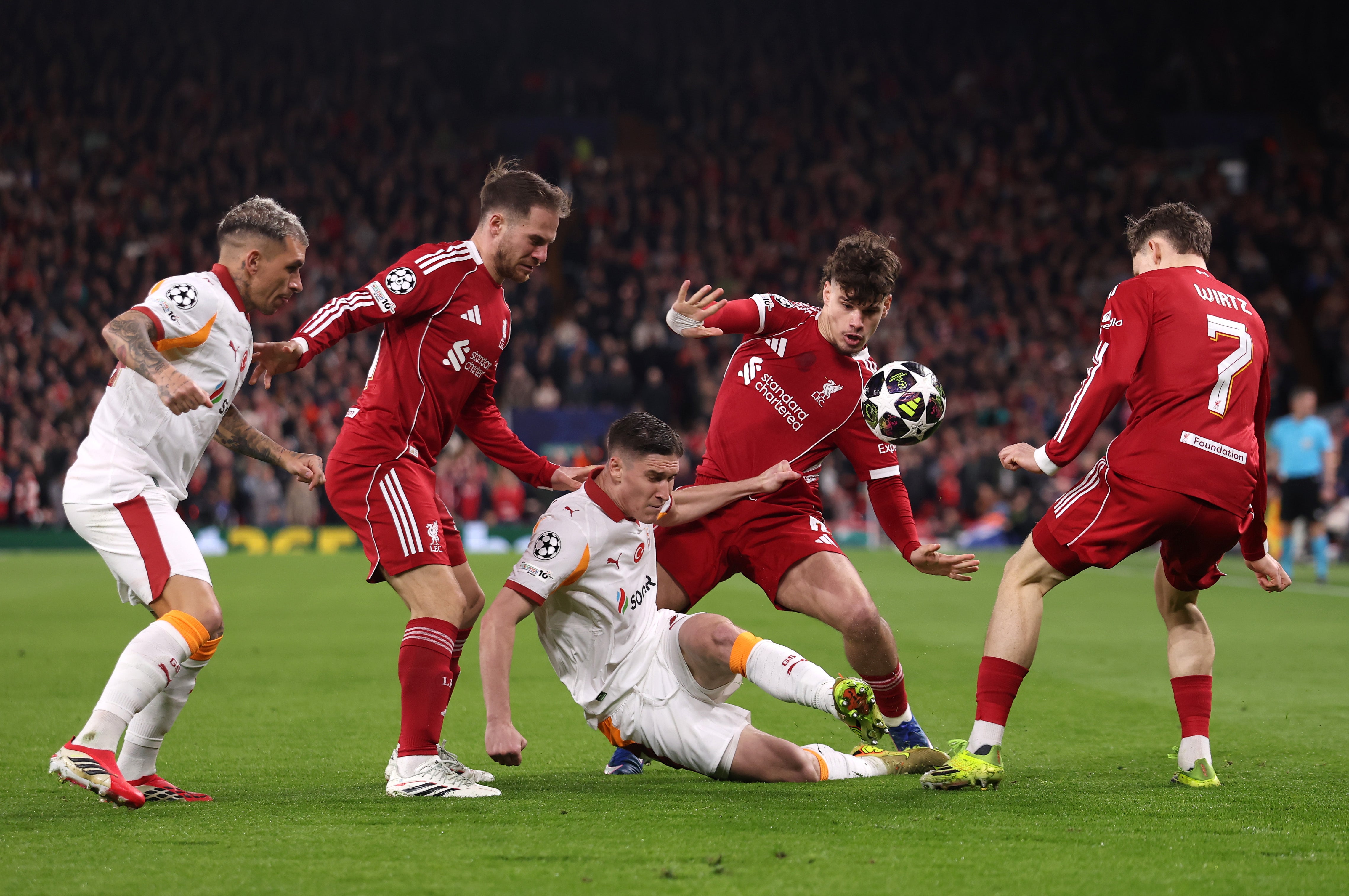 They had started at pace, and got a reward. Liverpool had conceded to Galatasaray’s set-pieces twice in Istanbul this season. They scored from one on Merseyside. It was beautifully worked, Alexis Mac Allister disguising a low corner and Szoboszlai delivering a first-time, left-footed finish from 15 yards. The routine was so expertly planned in that it ended up with the man who had the technique to provide the finish. It was, remarkably, Szoboszlai’s fifth Champions League goal of the season, to add to four assists. His name echoed around Anfield; the fans he had criticised for leaving early on Sunday recognise he has become a talisman.