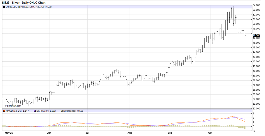A move in December CME micro silver futures below chart support at last week’s low of $46.82 would become a selling opportunity. The downside price objective would be $40.00, or below. Technical resistance, for which to place a protective buy stop just above, is located at $50.00.