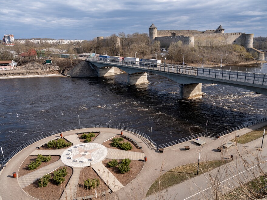 The Narva River and the Ivangorod Fortress, across the river on the Russian side. (/ Nora Lorek for NPR / Nora Lorek for NPR)