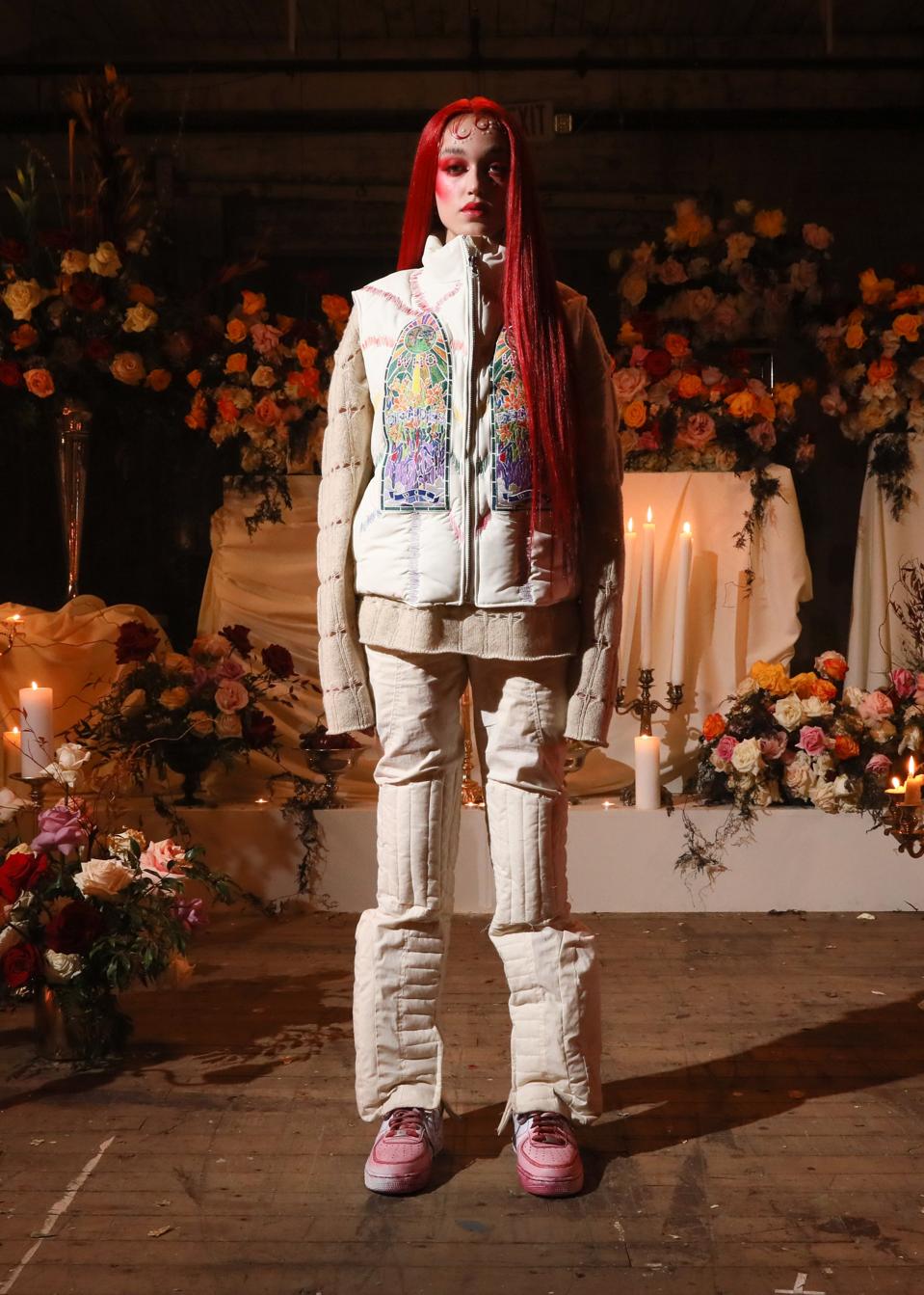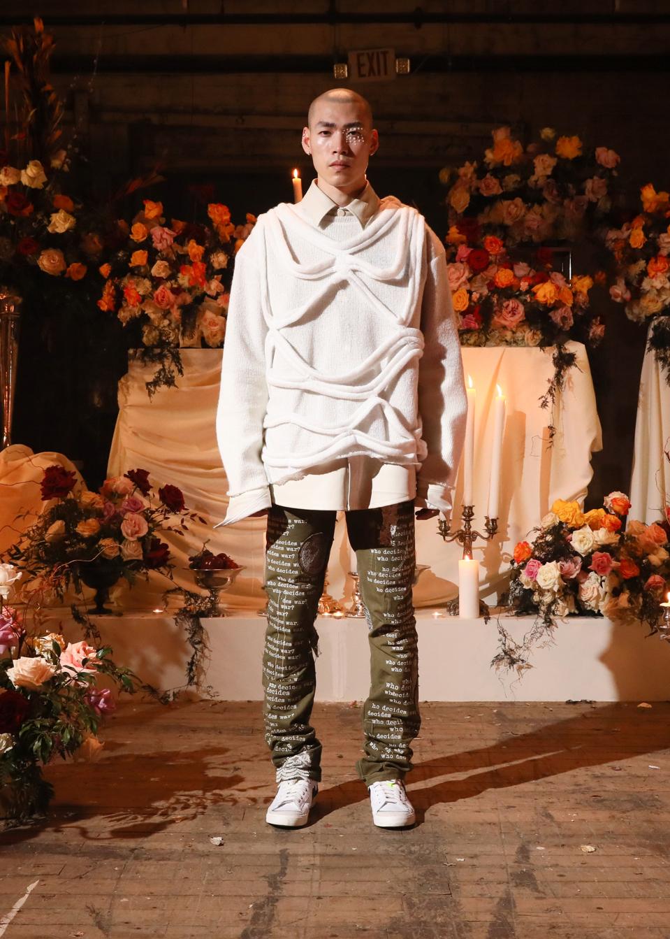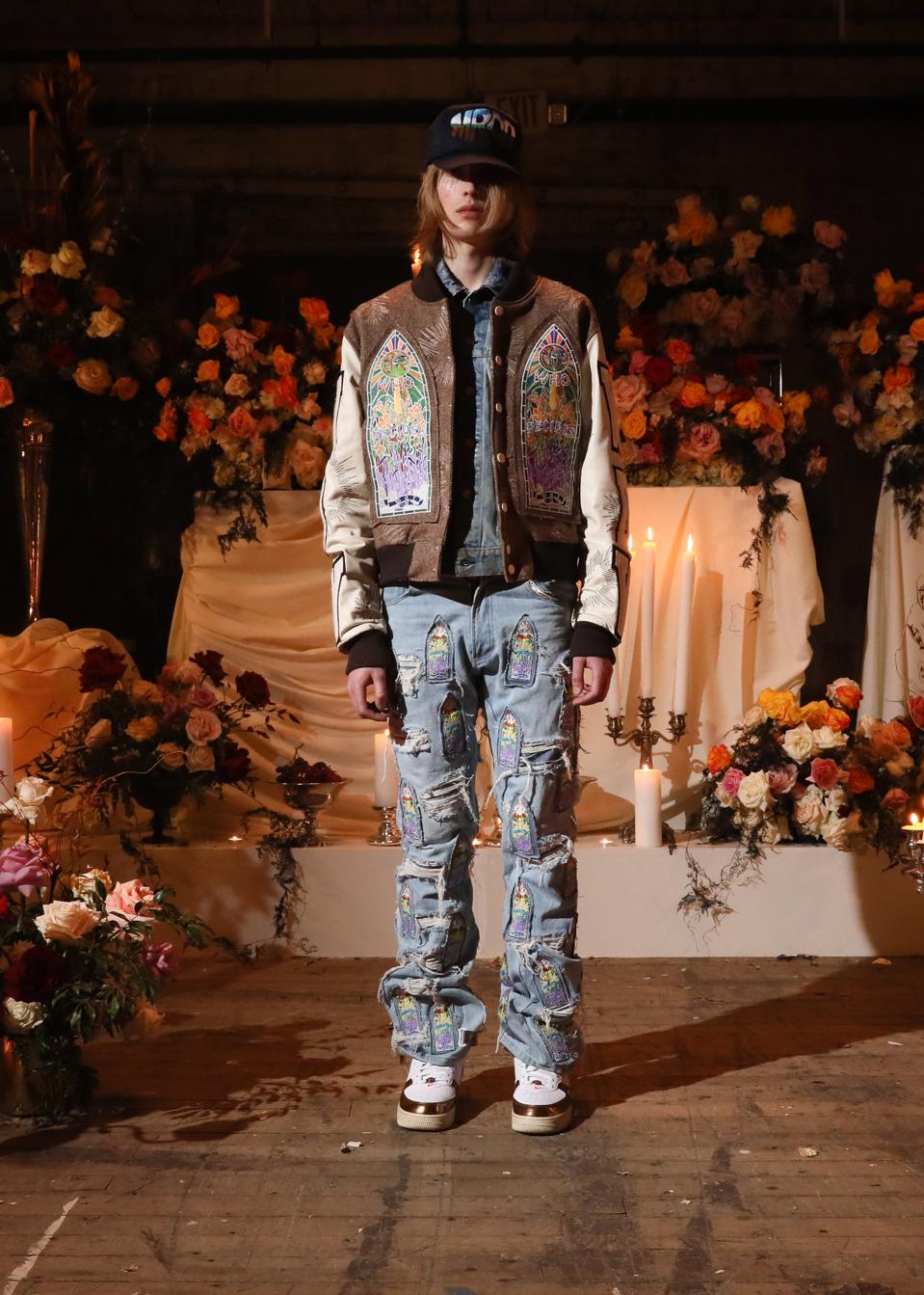 For its Autumn/Winter 2022 collection titled “Witness,” Who Decides War explores draping on a vest, as well as slacks and a bomber jacket. The stained glass design embroidered onto their denim styles is meticulously imprinted and found throughout varying other trousers, jackets, and button shirts of the collection, the sentiment remains present in their video lookbook presentation.