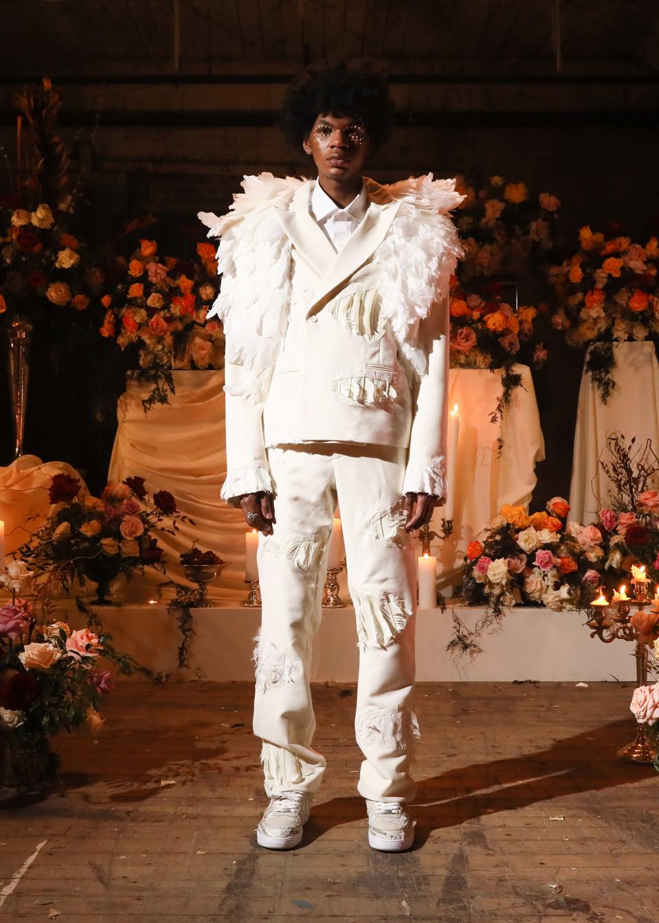 Bravado [also known as MurdaBravado on instagram] and D’Amore have also debuted their approach to suiting with double-breasted suits, adorned with feathers arranged in a hand-laid scalloped design. Each of the suits comes with uniques detailing and a removable shoulder applique, handmade in the Who Decides War New York studio.