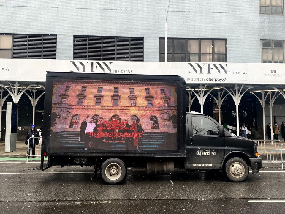 In the spirit of New York Fashion Week, Taveras put together a gorilla-style fashion show and campaign that involved a 4-minute video and a media ad truck as the medium. Parking the ad truck in front of Spring Studios in TriBeCa, he would play the lookbook video on a loop for any passerby to witness. This effort is something that many designers have implemented in the past - Virgil Abloh and his associates would launch the label Pyrex Vision, producing a pseudo-insidious video that featured many streetwear influencers. The video and collection lookbook, titled “Youth Will Always Wins,” would give way to younger designers coming from urban territories.
