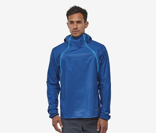 The Patagonia Storm Racer Waterproof Running Jacket has two long zips on the chest which unzip the jacket like a bib, making it a good choice to pair with a trail-running vest or hydration pack. The 3-layer waterproof shell is extremely lightweight, and the whole coat can be stowed in its own pocket, it’s that compact. The hood is drawstring rather than peaked, which makes the jacket compact, but means it’s a better choice for a trail run rather than a multi-day jaunt in the mountains.