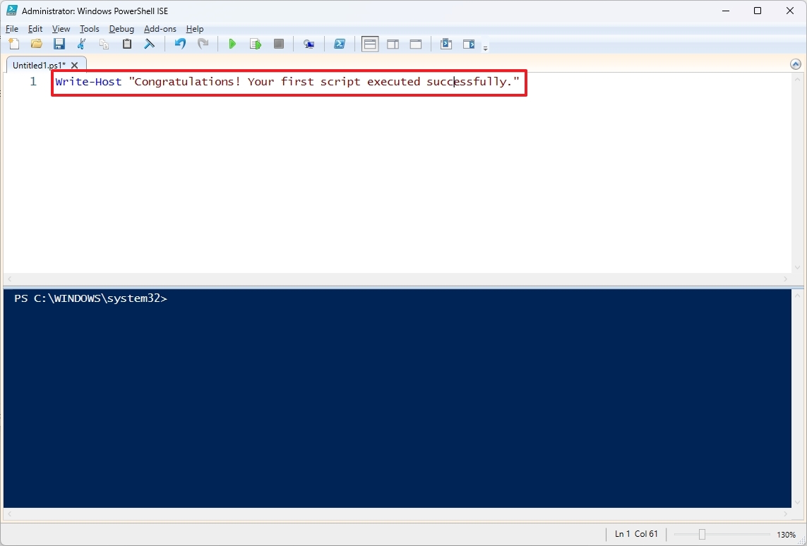 - Write a new or paste the script you want to run — for example, Write-Host "Congratulations! Your first script executed successfully"