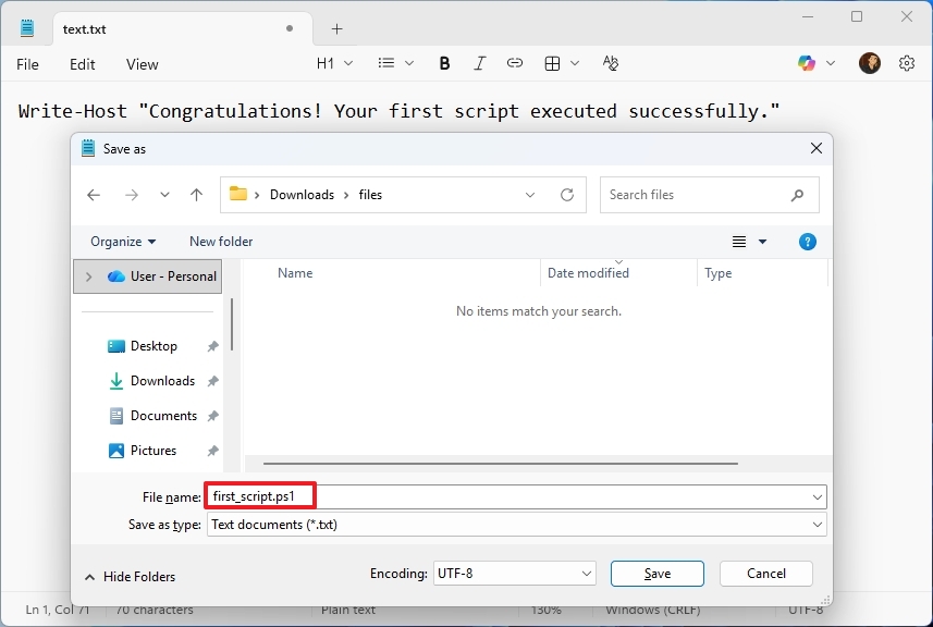 - In the "File name" field, specify a name for the file with the ".ps1" extension — for example, first_script.ps1.