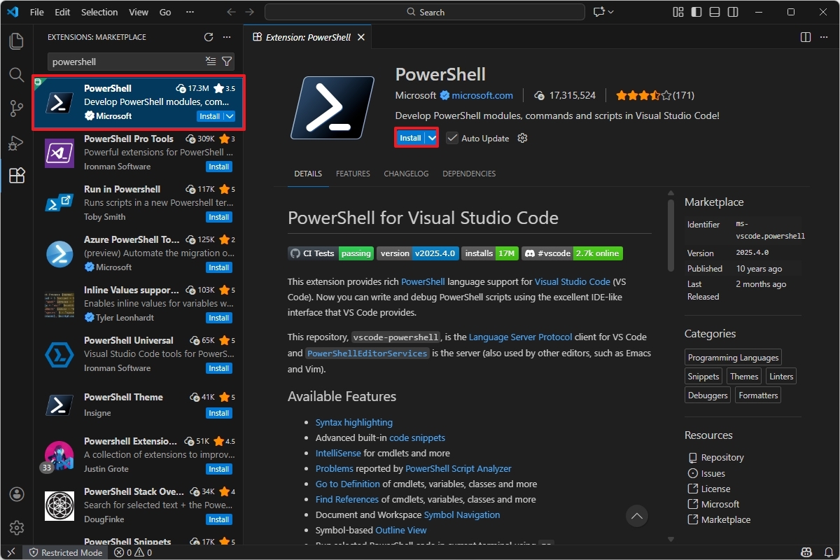 Once you complete the steps, you can continue installing the PowerShell extension for VS Code.