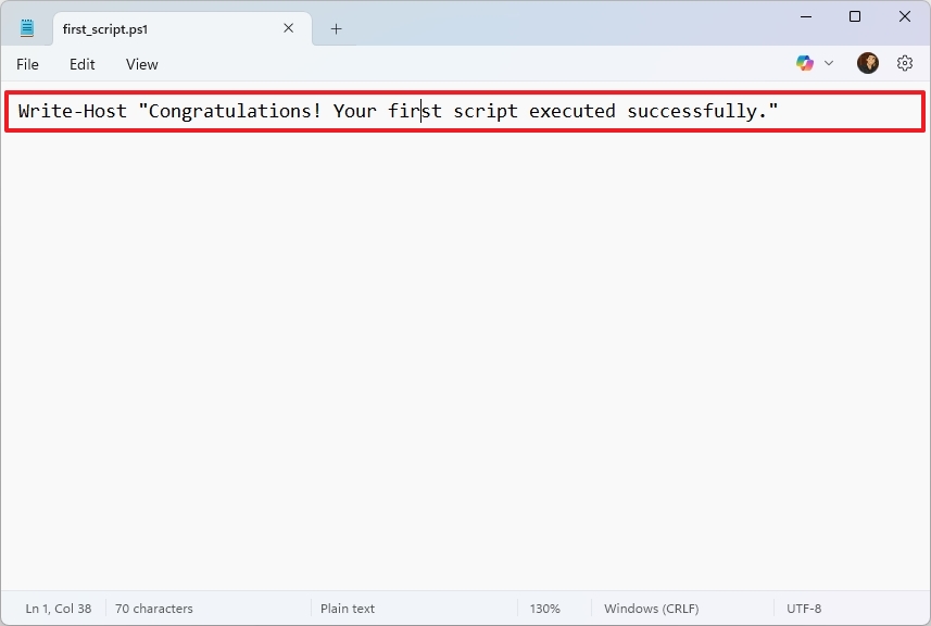 - Write a new script or paste your script into the text file – for example, Write-Host "Congratulations! Your first script executed successfully."