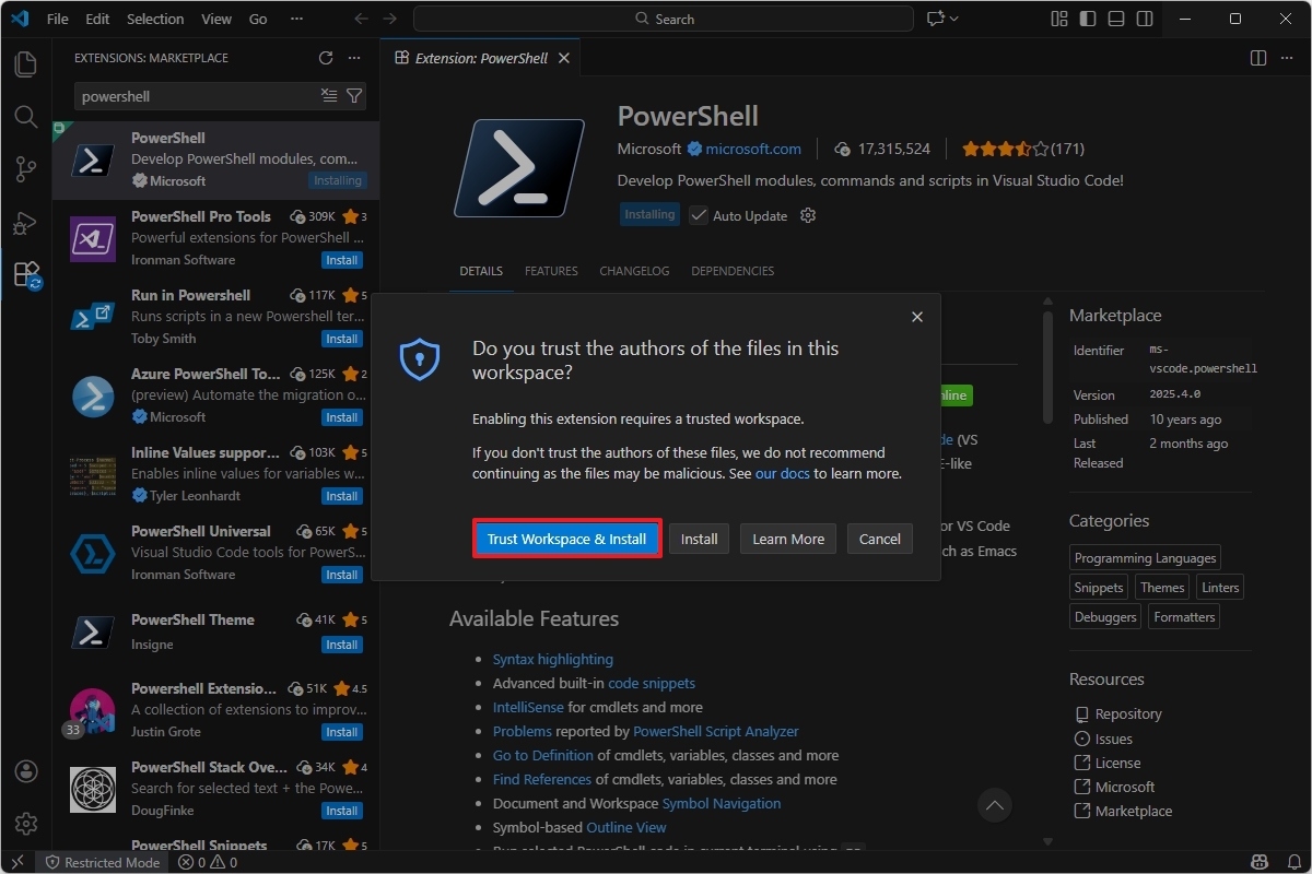 - Click the "Trust Workspace & Install" button.