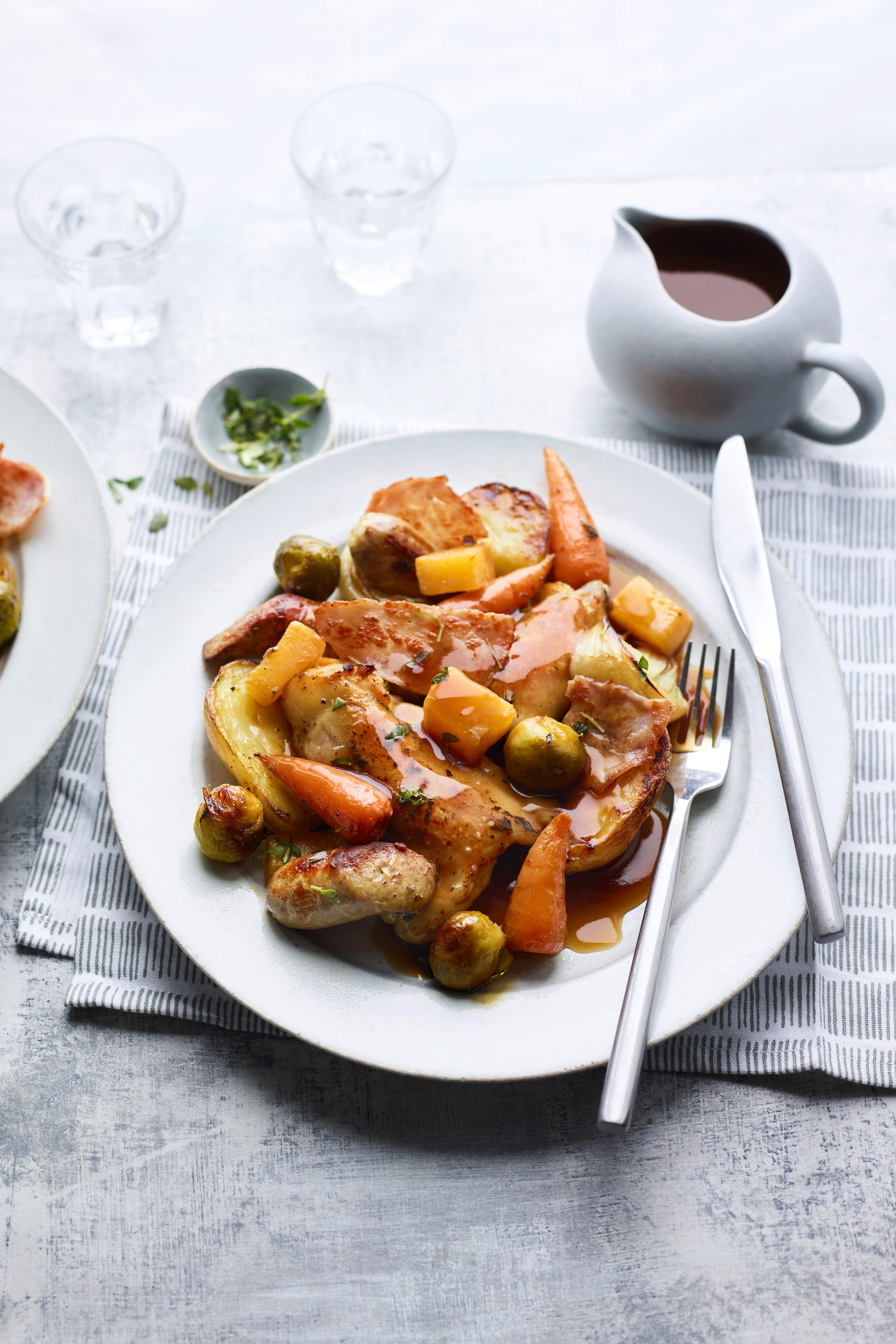 2. Spray a very large, non-stick deep-sided baking tray or roasting tin (about 40cm x 30cm) with low-calorie cooking spray. Add the chicken, potatoes, carrots, swede, onions, sprouts, thyme, a pinch of salt and some black pepper, and toss well.