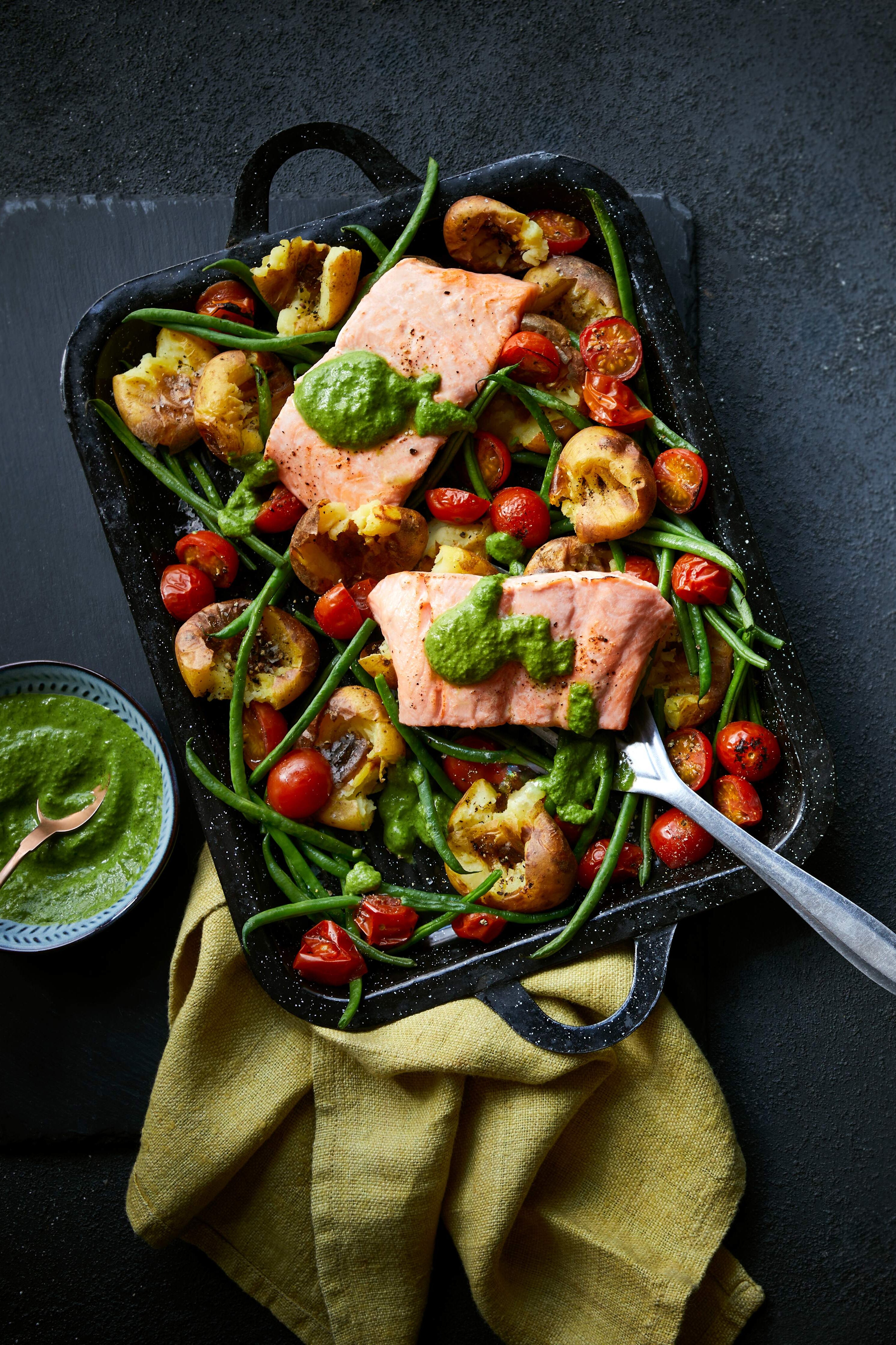 5. Divide the vegetables and salmon between plates and drizzle over the green sauce to serve – you can enjoy this hot or cold.