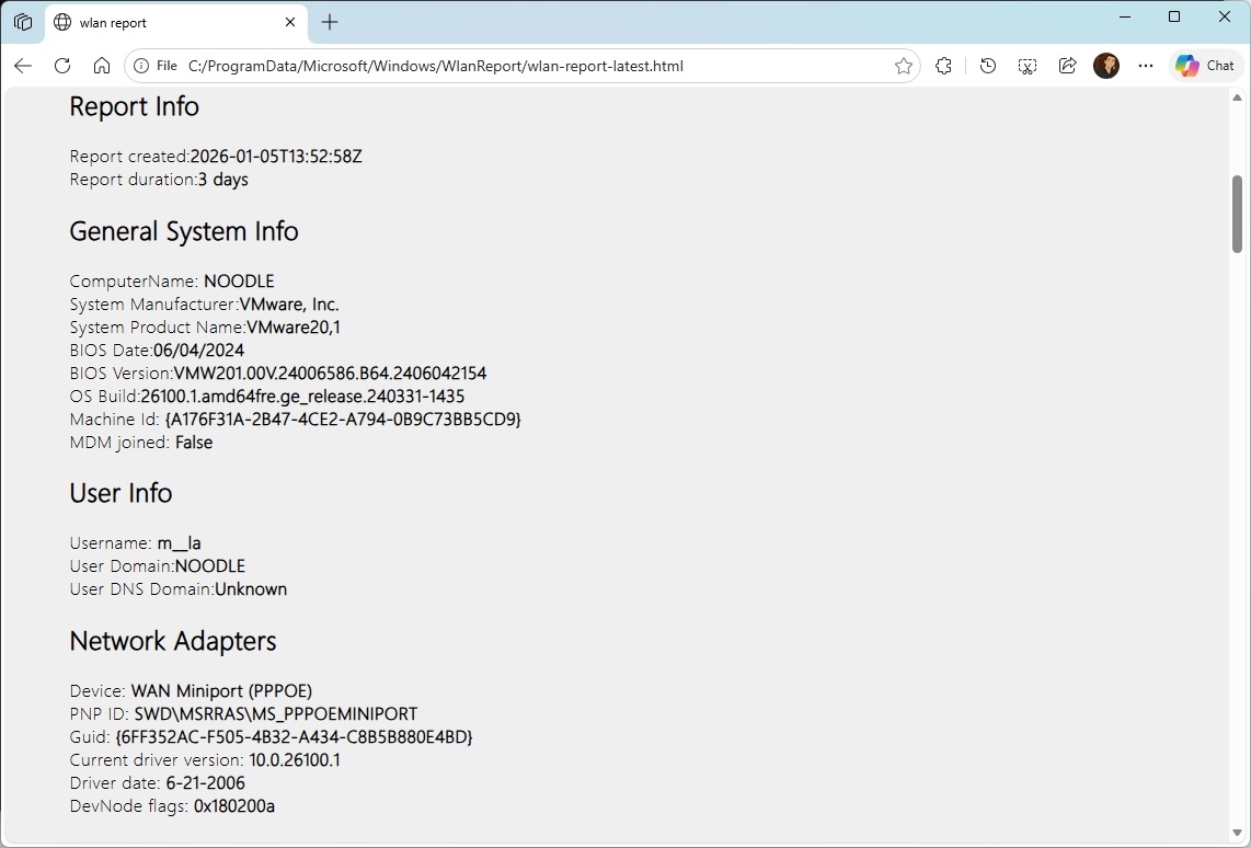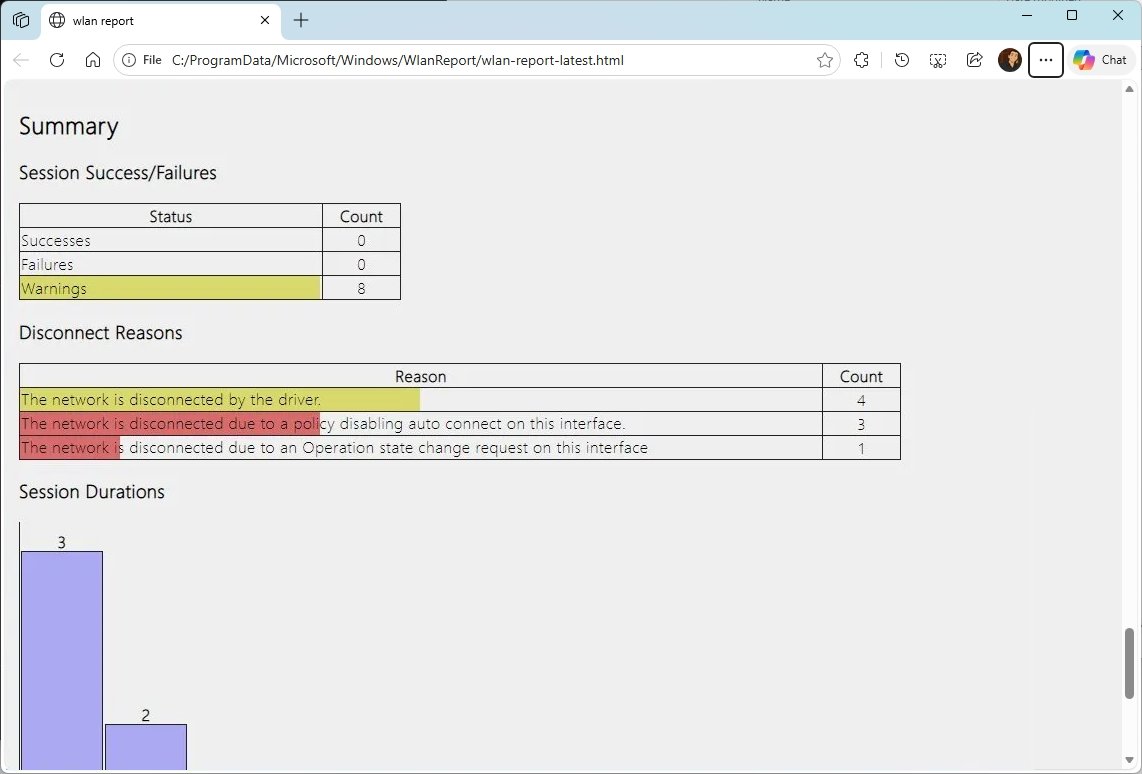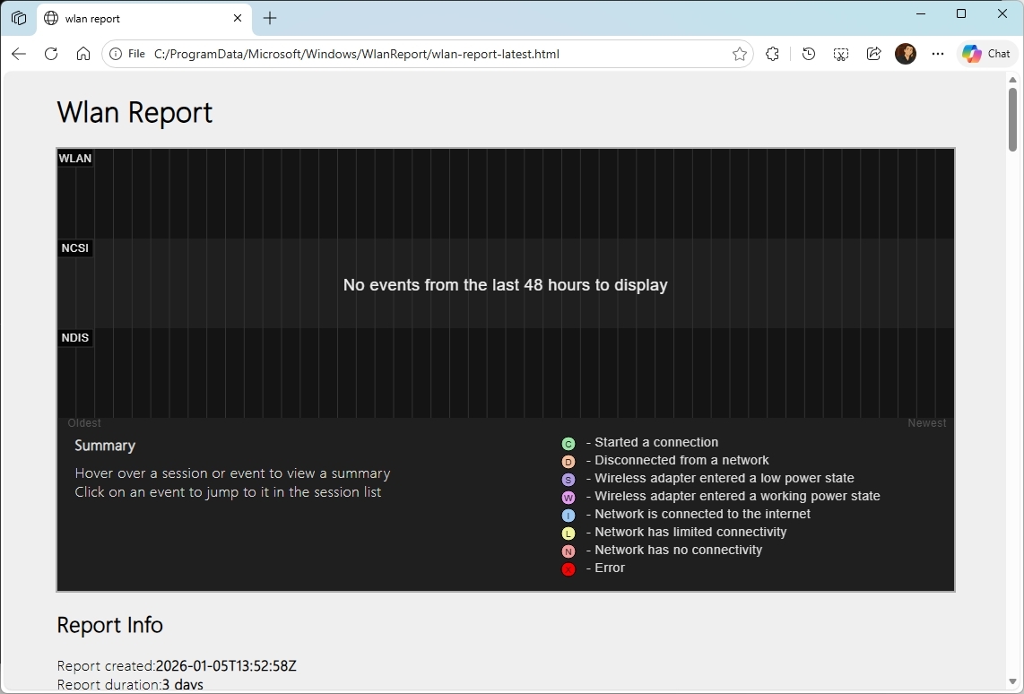 Using this report, you can identify driver-related issues, authentication failures, signal problems, and other networking errors that may be affecting performance or connectivity. In many cases, the information collected is enough to isolate the cause of the problem and take corrective action without relying on third-party utilities.