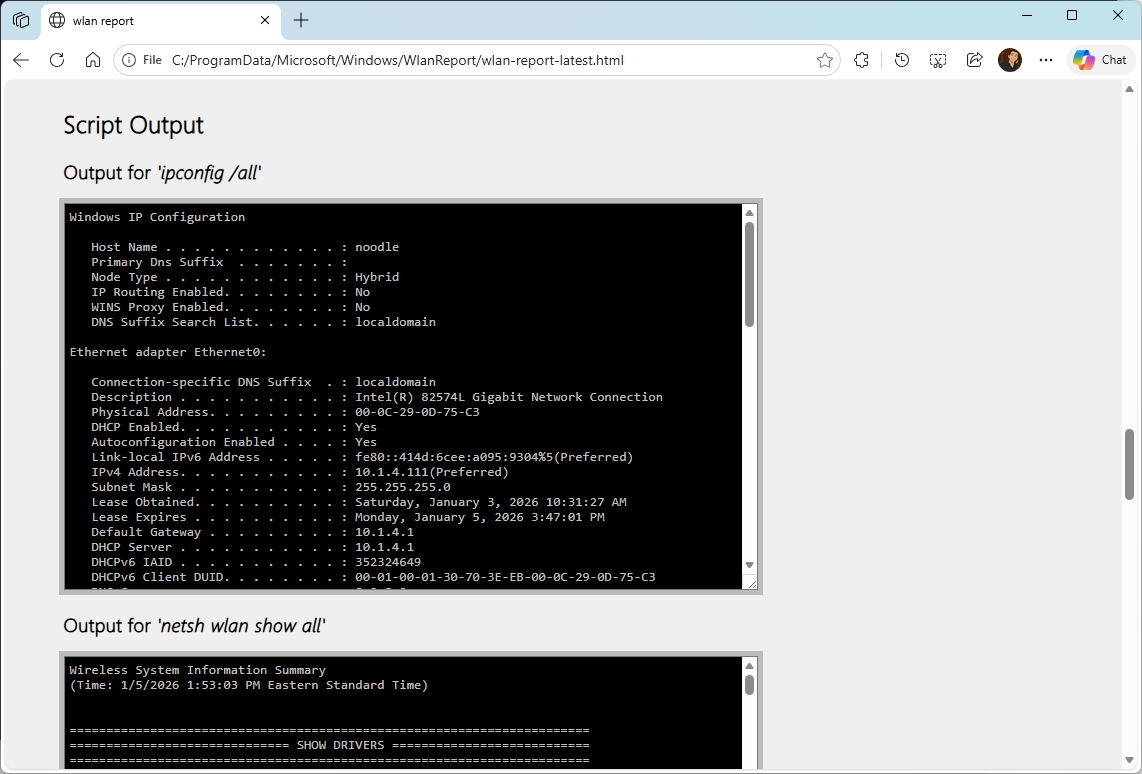 The "ipconfig /all" command shows the current network configuration for all the adapters. The "netsh wlan show all" command displays the driver and wireless details, including a list of available network access points. Also, the report runs a "certutil" command that uncovers details about the wireless profiles.