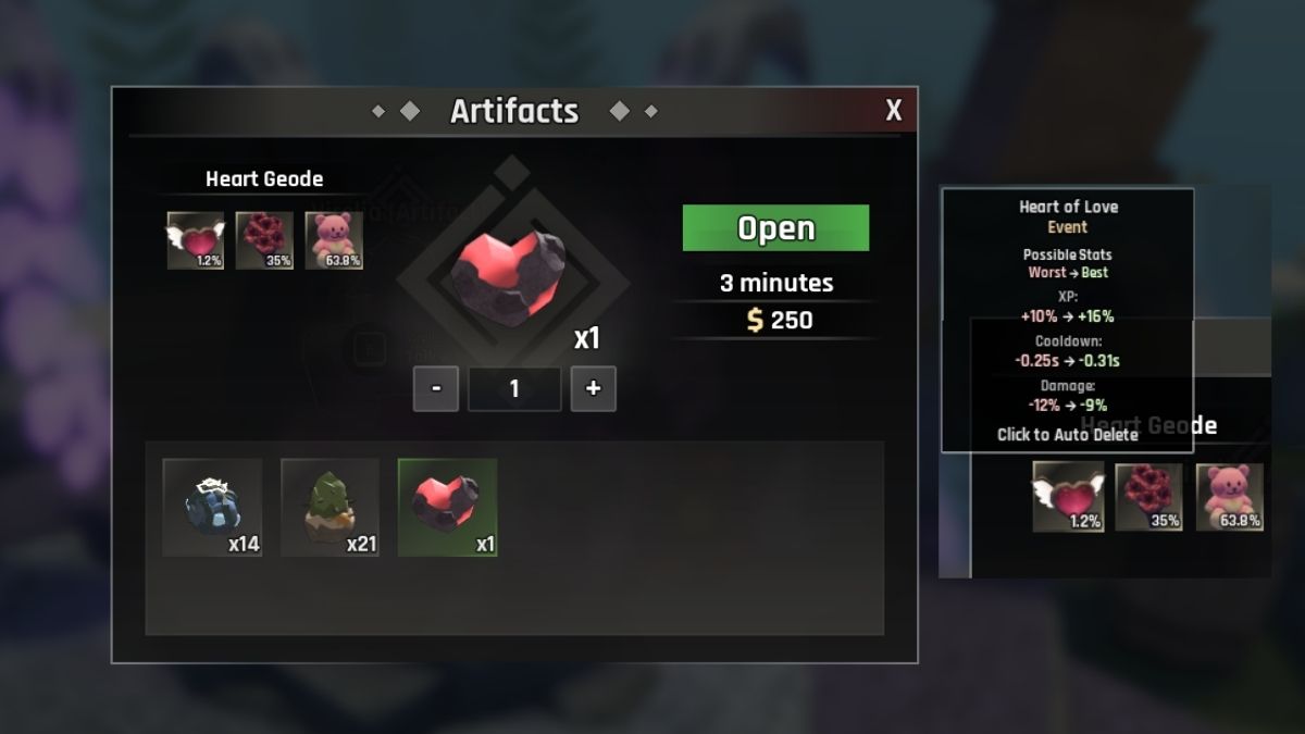 I fear that this heart needs to be broken if you want the Heart Geodes to be useful to you. Cracking a Geode is hard work, but it's very worth it because you get one of the three Artifacts which give you additional boosts: