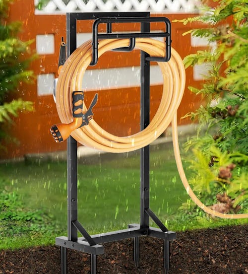 Create a home for your garden hose with this sleek hose holder. Crafted from rust-resistant alloy steel, this stand stakes into the ground and even includes bonus tool hooks for shovels, yard gloves, and more. The holder is designed to withstand weather like rain, and it has a hollow build to help water drain quickly.