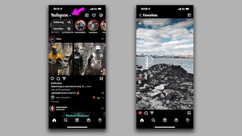 - You can find the Favorite feed in the same menu as the Following feed. Tap the down caret icon next to the Instagram header and select “Favorites.”