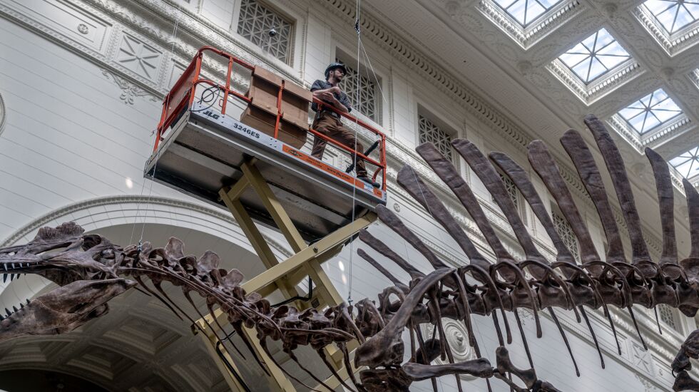 About six hours later, the repaired 46-foot-long Spinosaurus specimen was hoisted 12 feet into the air without a hitch in the museum’s Stanley Field Hall.