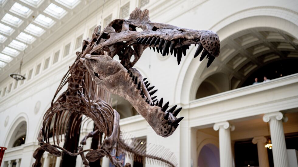 The museum has been promoting the new dino as 6 feet longer than its superstar T. rex, Sue. But the Spinosaurus is of a more delicate build. It was a semiaquatic creature that lived about 95 million years ago, roaming the rivers of Northern Africa.