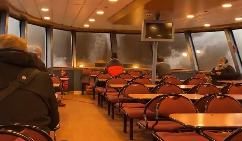 The film, recorded by a passenger in a seated area at the front, shows the ferry dip suddenly before its windows are engulfed by the wave.