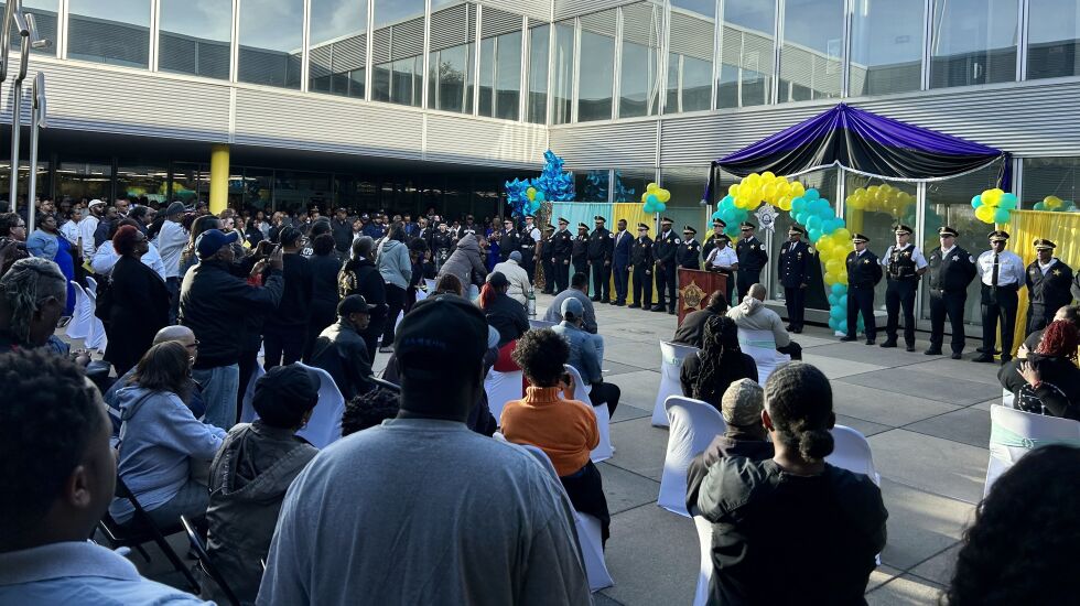 Hundreds gathered for the vigil at the 5th District police station, 727 E. 111th St., where Preston was assigned. Photos of a beaming Preston dressed in a cap and gown sat at a small table adorned with flowers. Above one photo a message read: “Peace For Preston.”
