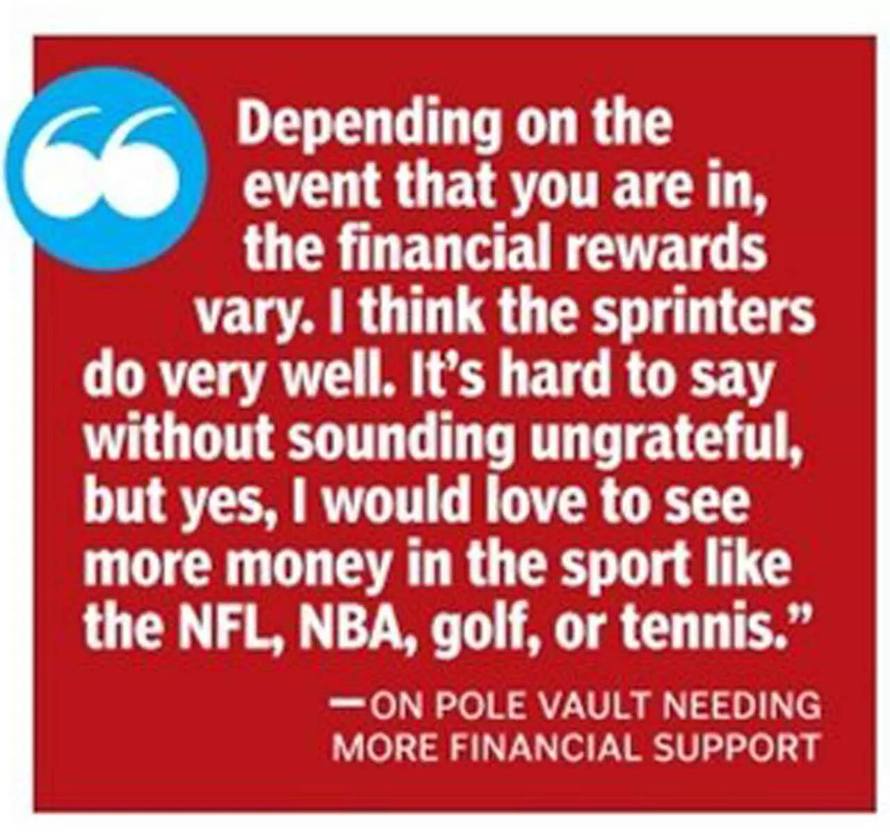 Depending on the event that you are in, the financial rewards vary. I think the sprinters do very well. You don't see the same kind of money in pole vault. I am fortunate to have a sponsor and be able to support myself financially. If I can live independently for my family and do this thing that I love, then that's all that matters. Thankfully I am in a position where I can save up and have a cushion for my next endeavour.