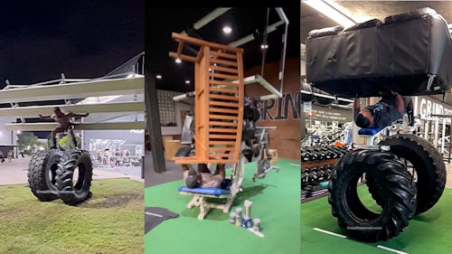 Are these “workouts” dangerous? Yes. It doesn’t take an expert to surmise that one shouldn’t be lifting weights while also lifting outdoor furniture, no matter how strong they are. But the danger, in this case, kind of is the point. Whether we like to admit it or not, we love to watch people live “on the edge” even if the “edge” in this case is actually two huge tractor tires.