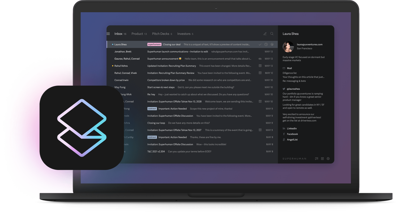 When you view a contact, Superhuman shows their full name, location and links to social profiles or personal websites, giving you quick context before responding.