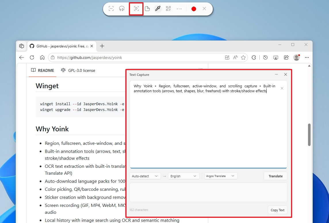 One of the most practical features is its OCR engine. Yoink can extract text from any region of your screen and present it in a dedicated window where it can be edited, copied, or translated.
