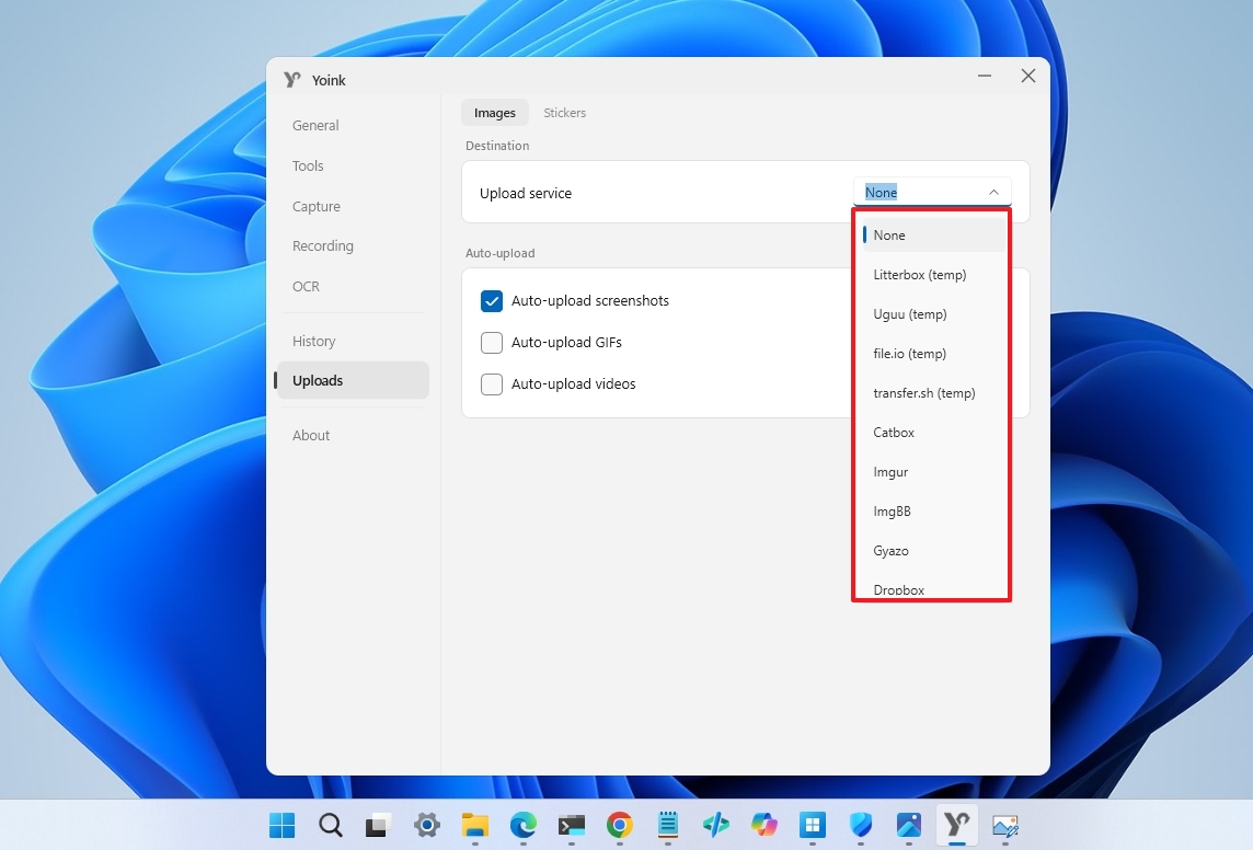 Sharing is another area where Yoink aims to compete with more advanced tools. It supports uploads to a wide range of services, from public image hosts to cloud storage providers (such as Imgur, Dropbox, ImgBB, and more) and even self-hosted environments.