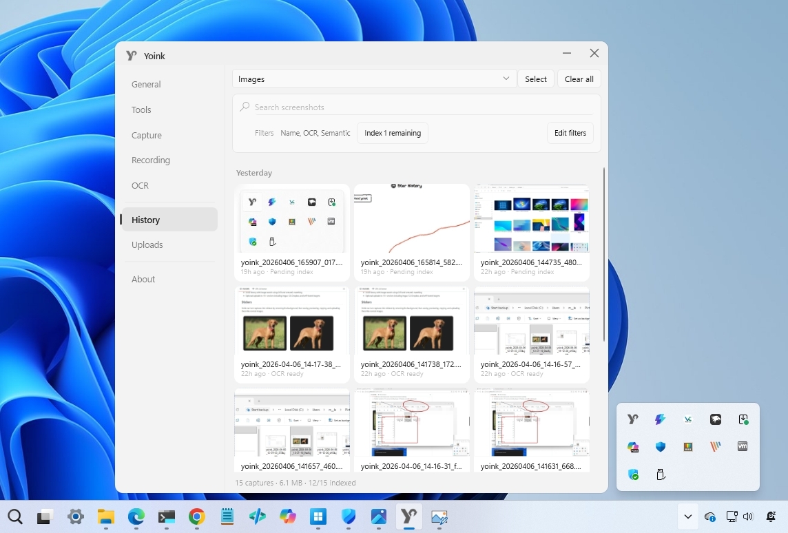 Yoink doesn't just save your captures. It indexes them. Every screenshot becomes part of a searchable library where you can find images by filename, by text inside the image using OCR, or even by semantic similarity. This means you can search for what the image contains, not just what you named it.
