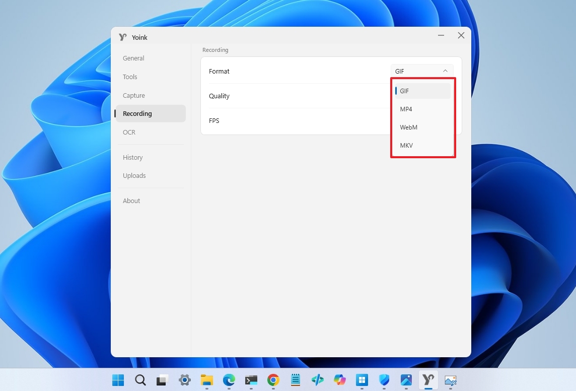 Beyond screenshots, Yoink also includes a recording system that captures video in formats such as GIF, MP4, WebM, and MKV. It supports both microphone and system audio, making it suitable for tutorials, demos, and quick recordings.