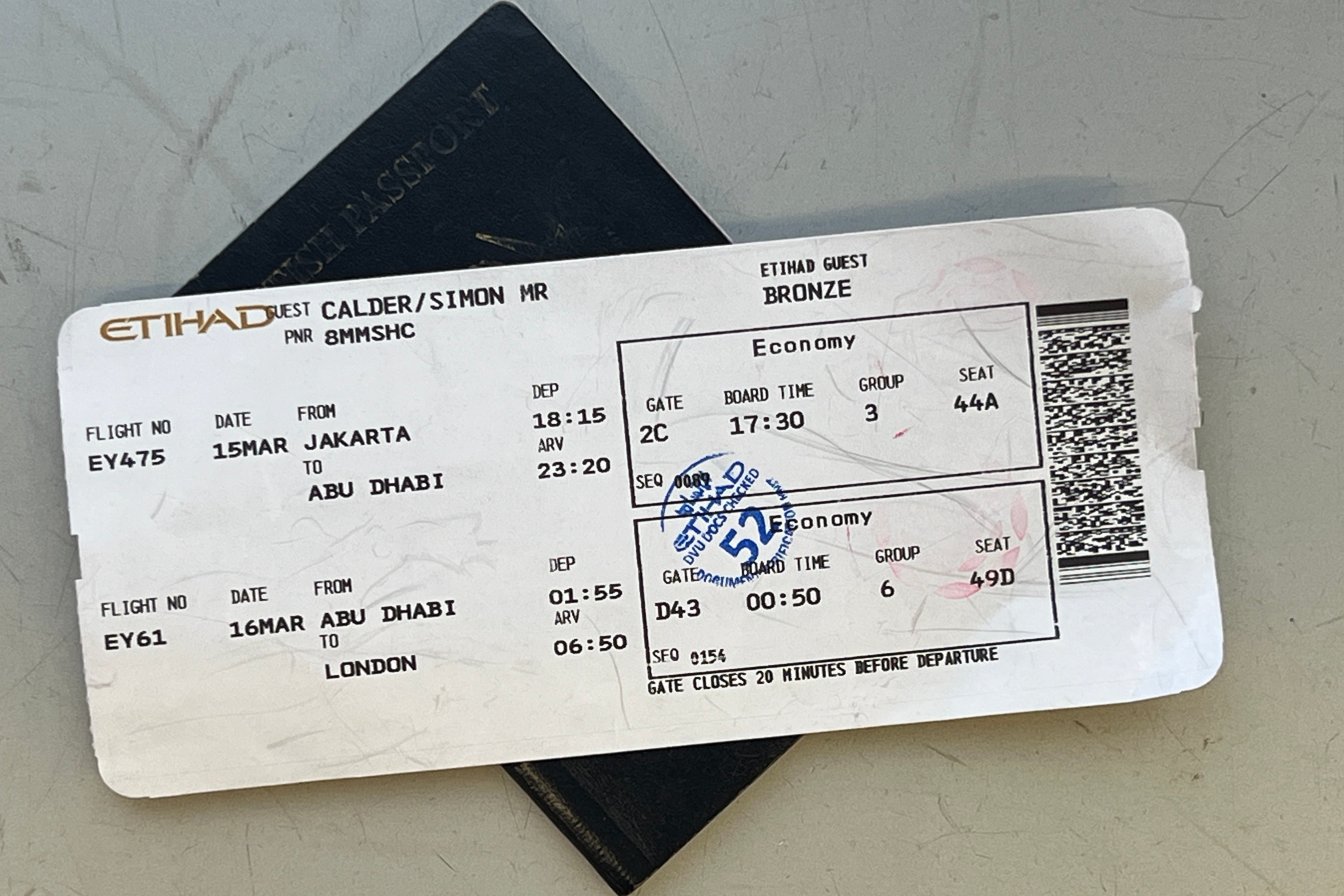 Just the ticket: Boarding pass for flight from Jakarta via Abu Dhabi to London (Simon Calder)