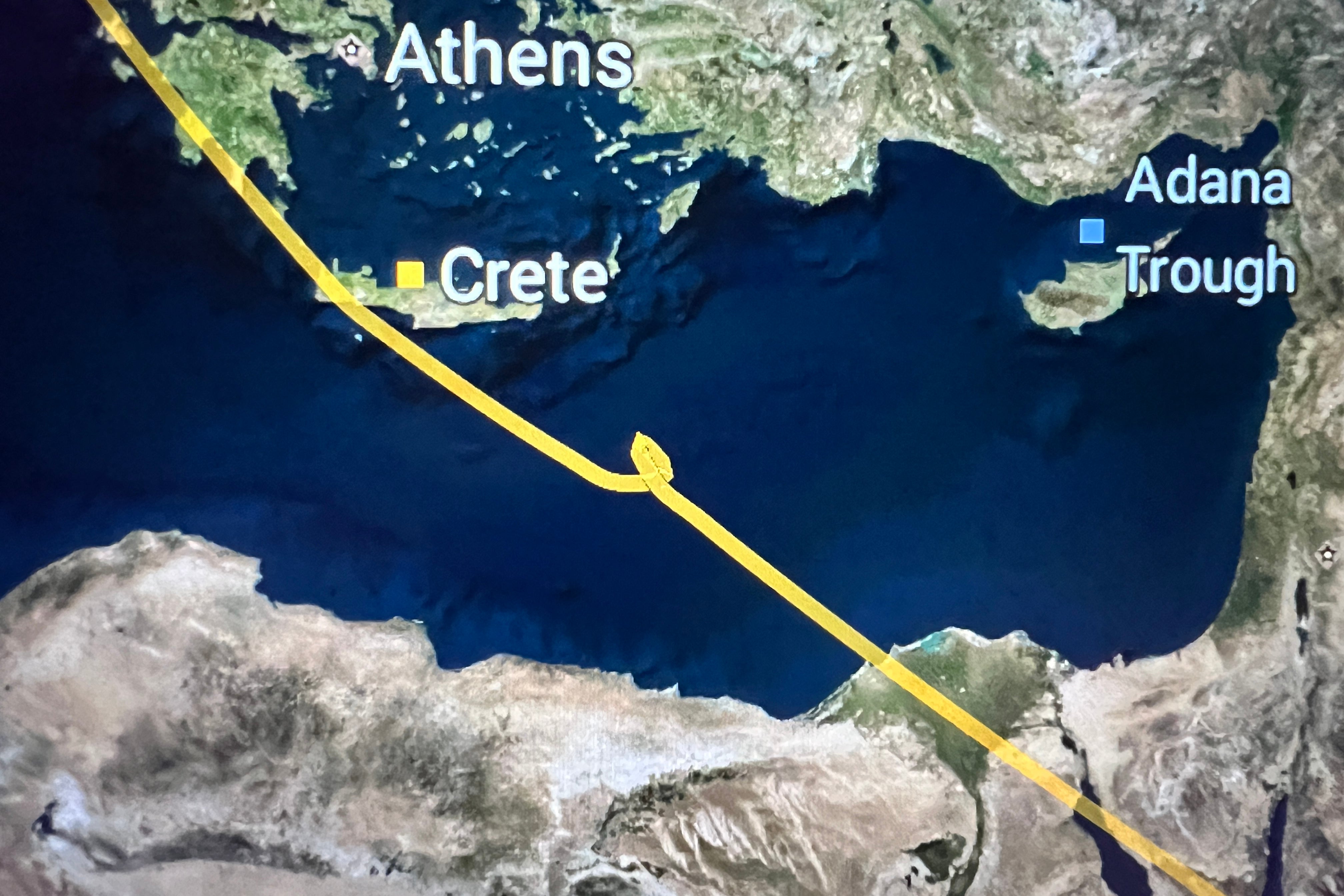 The sky map shows the pilots making a loop just when leaving Saudi airspace and crossing the neck of the Gulf of Aqaba to Egypt’s Sinai Peninsula. This is not a common technique. It is usually deployed to delay the aircraft so it can enter a sequence of other planes as specified by air traffic controllers.