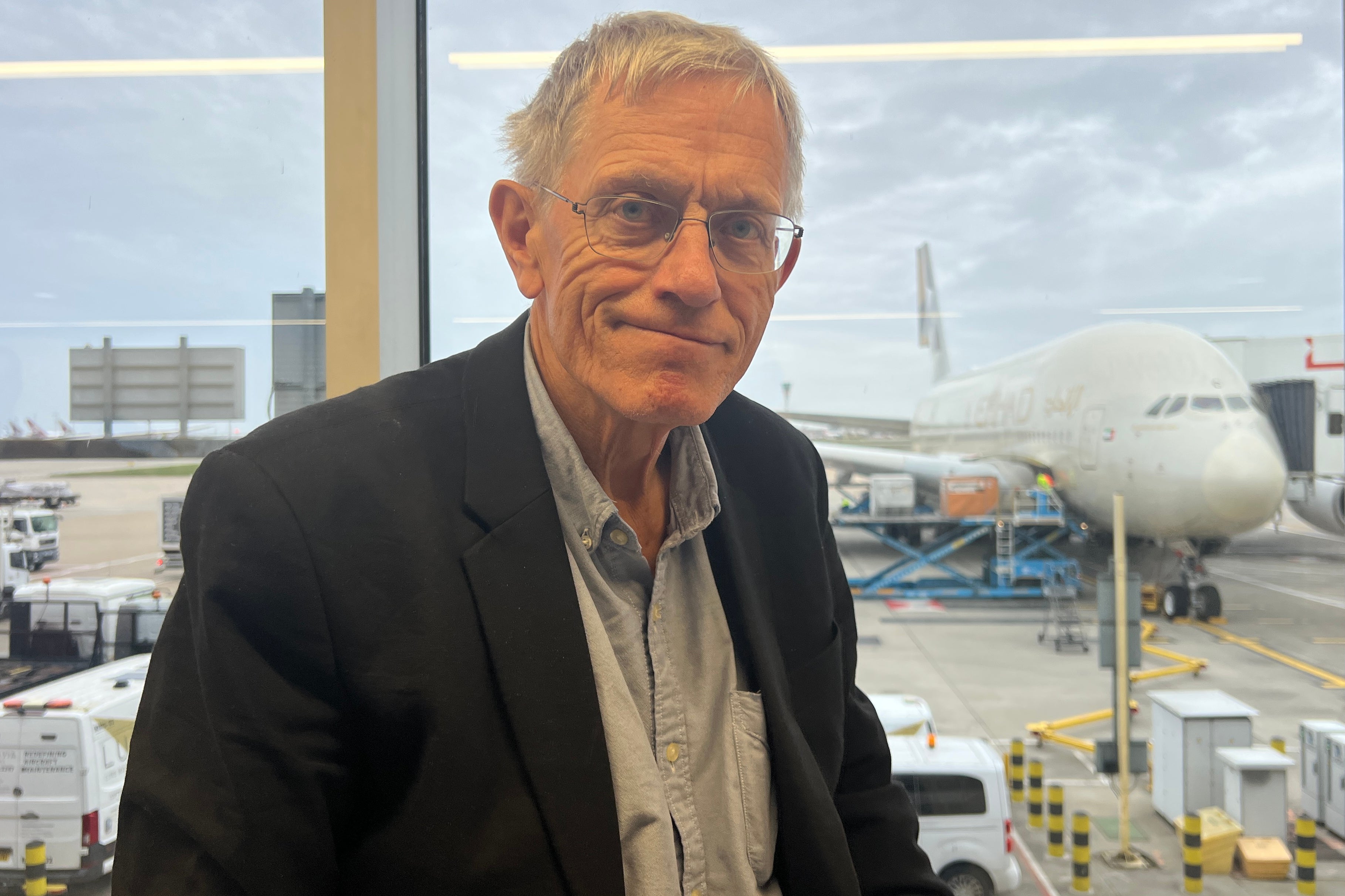 Now, where's that tea? Simon Calder on arrival at London Heathrow, with the Etihad jet in the background (Charlotte Hindle)