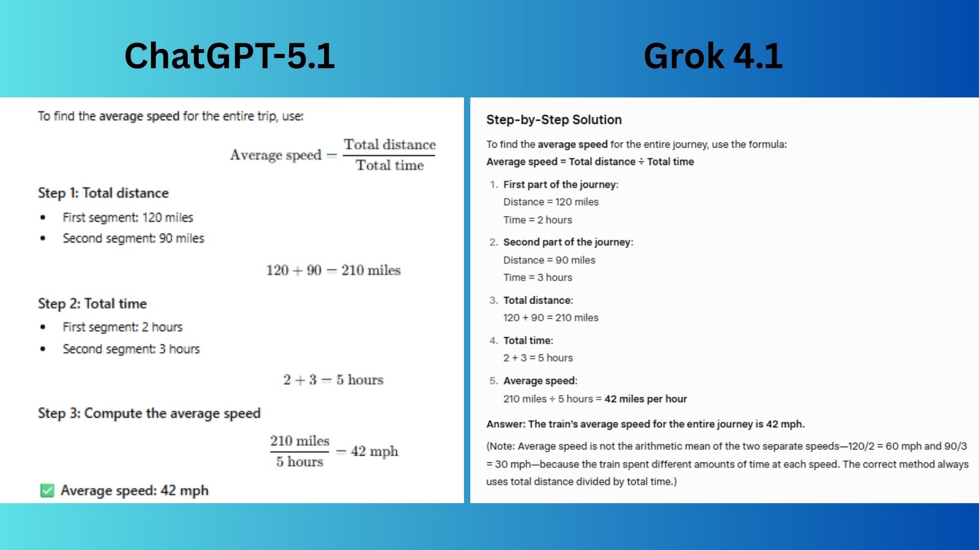ChatGPT-5.1 correctly calculates the average speed with a clear, step-by-step mathematical breakdown.