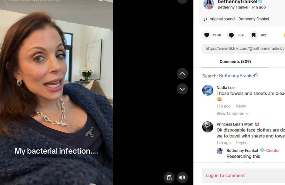Bethenny Frankel has blamed hotel towels after she contracted a bacterial infection on her face.