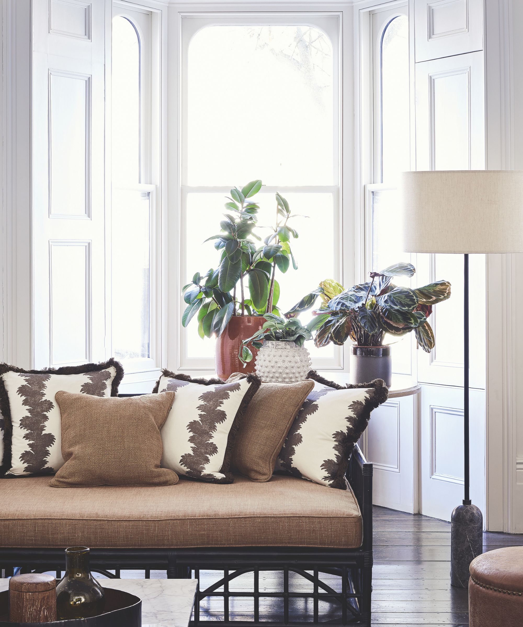 Not only do they add bags of character to an otherwise plain white wall, but the unpainted wood of Amanda Seyfried's shutters anchors the whole room in a calming and light-filled space, proving that shutter ideas really are the ultimate window treatments for period homes.